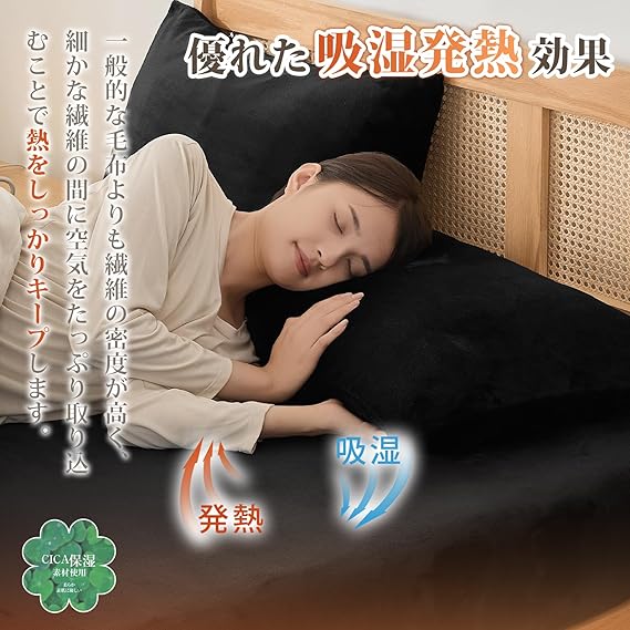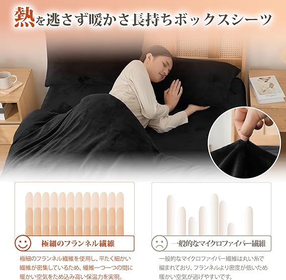 【あったか接触温感&蓄熱保温機能】本品の冬用ボックスシーツは高密度プレミアムフランネル生地を採用しています。マイクロファイバーが高密度に詰まっており、毛足に空気を多く包み込んでいるため、暖かい空気をしっかりと閉じ込め、蓄熱保温性に優れています。布団に入った瞬間、ふわふわぽかぽかな暖かさに包まれます。肌寒い秋冬に欠かせないアイテムになります。