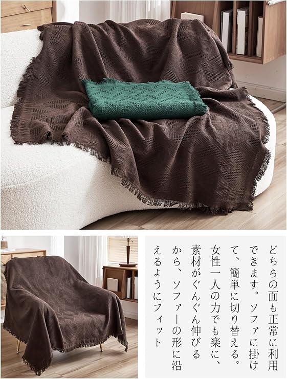 【製品仕様】180×300cm(3人掛け)。シンプルなデザイン、リバーシブル、滑り止め、快?、蛍光染料は使用しておりません、優れた通気性。着脱簡単、多機能、四季通用、北欧風、フリンジ付き。