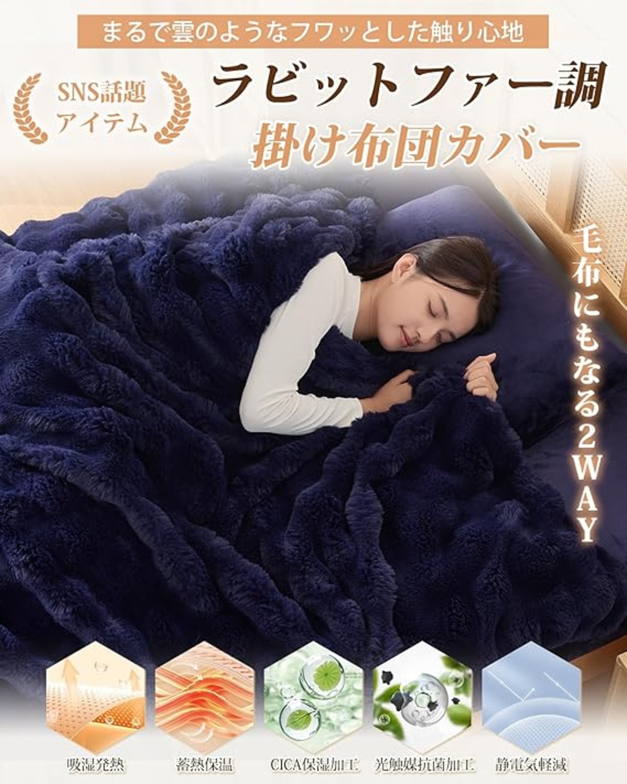 Softime 掛け布団カバー シングル 冬 暖かい 羽毛布団カバー 毛布カバー モコモコラビットファー調 毛布にもなる2WAY仕様 『極暖・プラス5℃蓄熱保温』吸湿発熱 あったか CICA保湿加工 静電気防止 抗菌防臭 エッコテックス認定 スナップボタン8箇所&ダブルファスナー フランネル 掛けふとんカバー 掛けカバー(シングル・150×210cm ネービー) a
