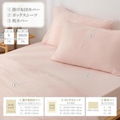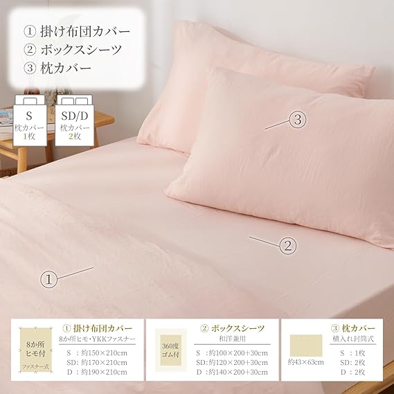 【セミダブル・4点セット】セット内容:掛け布団カバー×1、ボックスシーツ×1、枕カバー×2(合計4点)。 ※掛け布団カバー:約170×210cm、8か所ヒモ付き、片側全開YKKファスナーで着脱簡単。 ※ボックスシーツ:約120×200×30cm(マチ)、和洋兼用で厚さ約25cmまで対応、360度全周ゴム付きでずれにくい。 ※枕カバー:約43×63cm(標準サイズ対応)、封筒式で枕の出し入れがスムーズ。