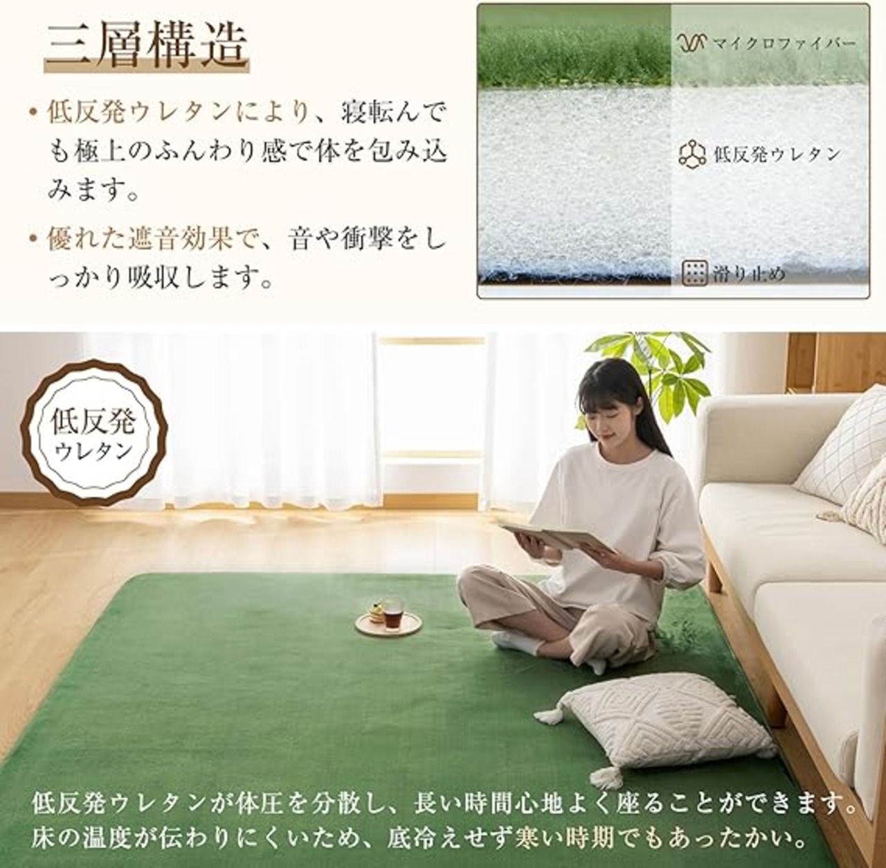 【低反発ラグマット】厚さ約15mmの低反発ラグマットは、ふんわりとしたやさしい踏み心地で底付き感がなく、ゆったりとリラックスできます。体重などの圧力が一点に集中せずに分散されるため、座っても寝転んでも体に負担がかかりにくく、快適にお過ごしいただけます。 さらに、厚みのあるウレタンが生活音や衝撃をしっかり吸収し、毎日の暮らしをより快適にサポートします。