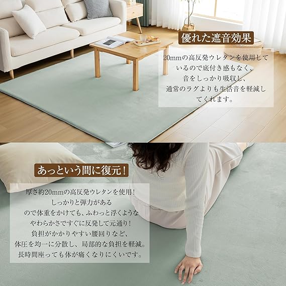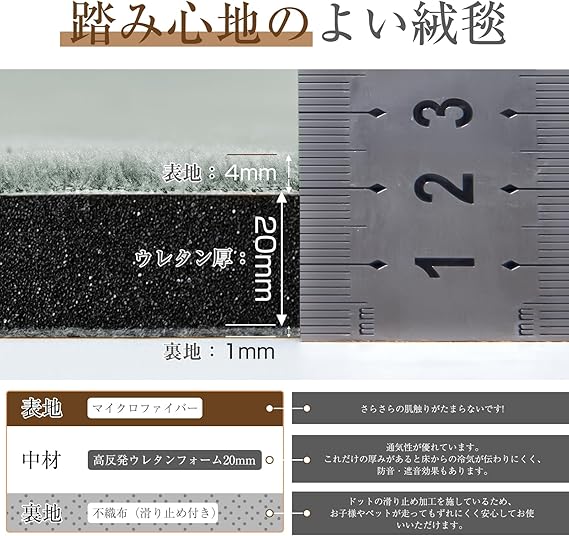 【極厚25mm高反発カーペット】優れたクッション性と復元性を兼ね備えた高反発ウレタンを贅沢に使用。ふんわりとした踏み心地で底付き感がなく、生活の中で発生するさまざまな衝撃音をしっかり吸収。快適な毎日の空間づくりをサポートします。