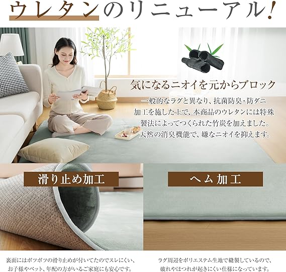 【抗菌・防臭・防ダニ・滑り止め加工】お子様やペットがいるご家庭でも安心してお使いいただけるよう、本商品には抗菌防臭・防ダニ加工を施しています。さらに、ウレタンには特殊製法でつくられた竹炭を配合しており、天然の消臭効果で気になるニオイを元からしっかりブロックします。 また