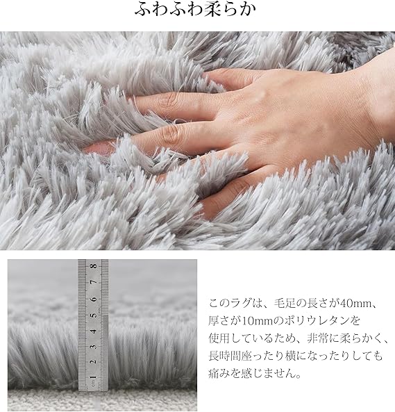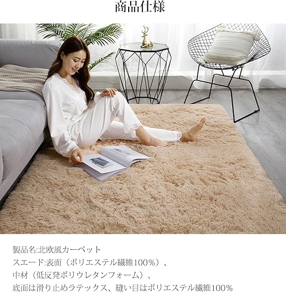 【厚手版仕様】寸法: 120 x 160 cm。材質:表面(ポリエステル繊維100%)、中材(低反発ポリウレタンフォーム)、底面は滑り止めラテックス、縫い目はポリエステル繊維100%、毛足の長さは約40mmです。弾力性、遮音性にも優れ、臭いもありません。