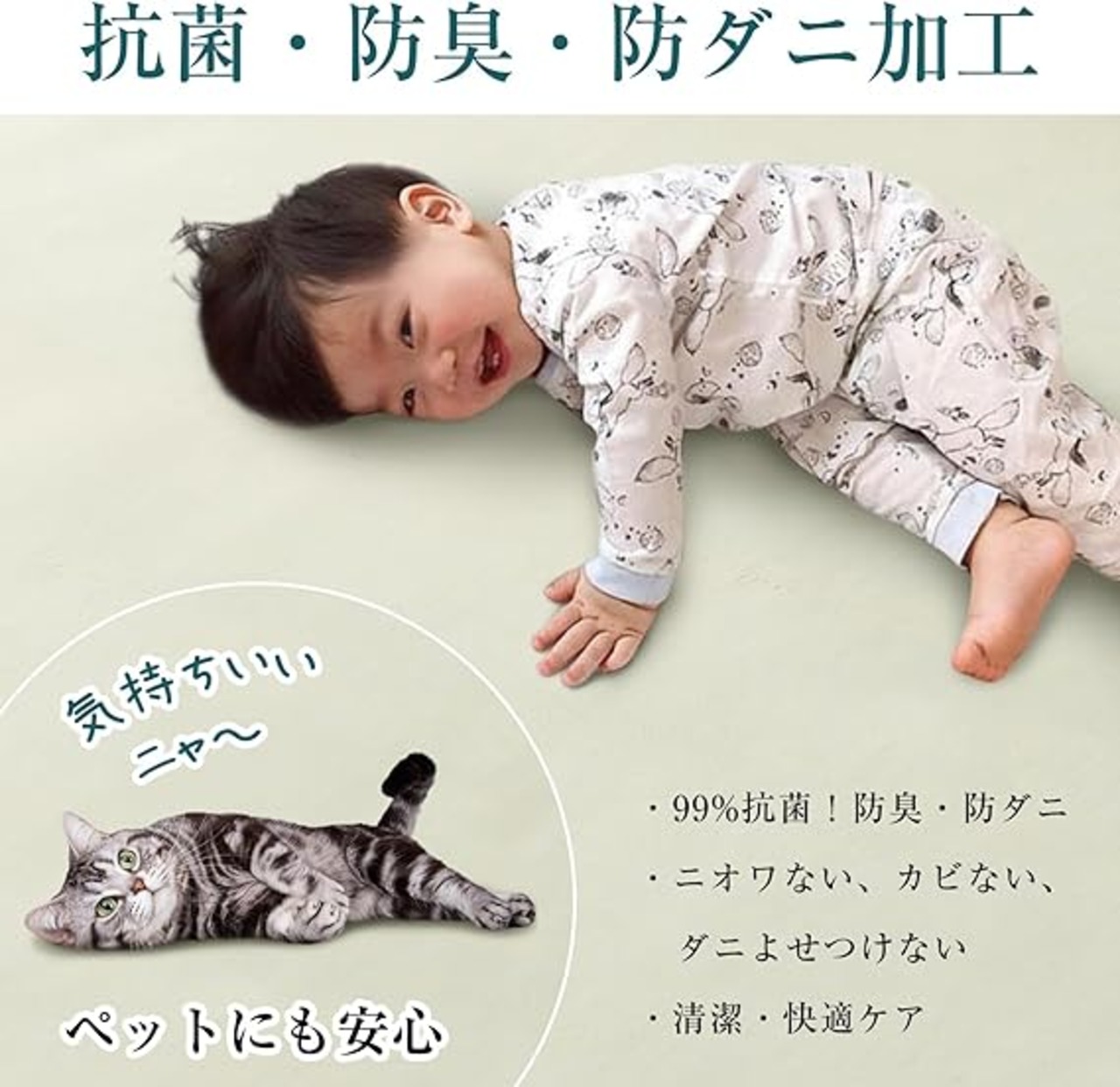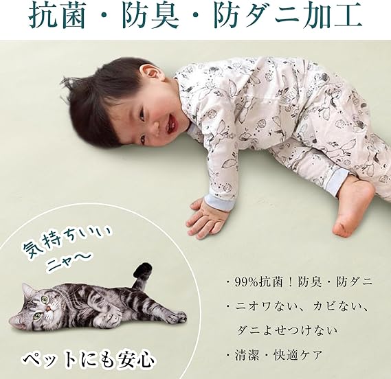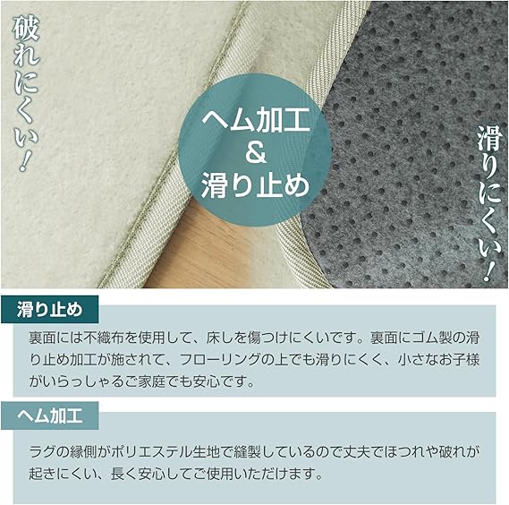 【抗菌防臭・安全安心】ラグには抗菌・防臭・防ダニ加工が施されており、清潔な状態を長く保ちます。小さなお子様やペットがいるご家庭でも安心してご利用いただけます。アレルギーが気になる方も安心してご利用いただけます。
