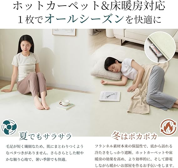 【フランネル素材・オールシーズン対応】カーペットは柔らかいフランネル素材を使用しており、夏はさらりと、冬は暖かく、季節が考えなくて年中使えます。色落ちせず、抜け毛もない、夏は冷房対策、冬はホットカーペット・床暖房対応。リビングや寝室に最適で、毎日のくつろぎをサポートします。