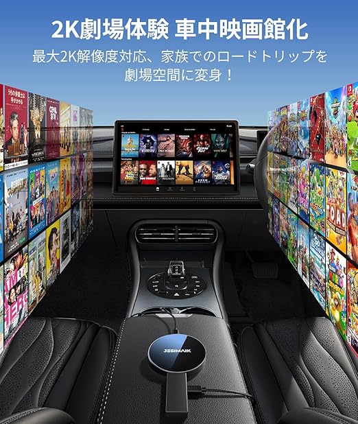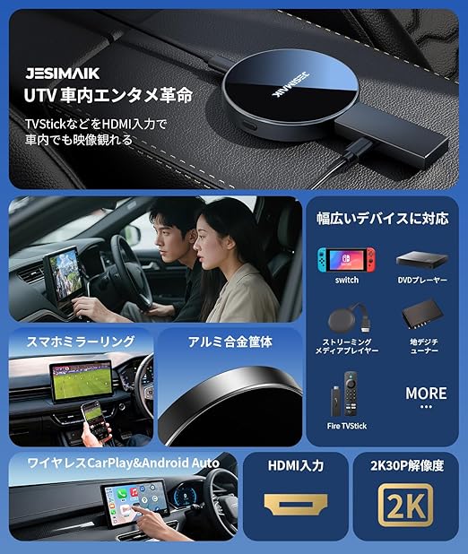 JESIMAIK UTV HDMI入力 ワイヤレスCarPlay/Android Auto 3-in-1アダプター HDMIマルチメディア TVstick/ゲーム機/地デジチューナー/DVDプレイヤーなど接続可能 スマホミラーリング 最大2K 出力 CarPlay/Android Auto搭載 自動接続 アルミ合金筐体 a