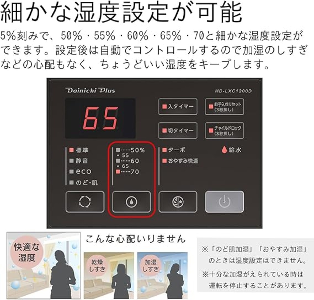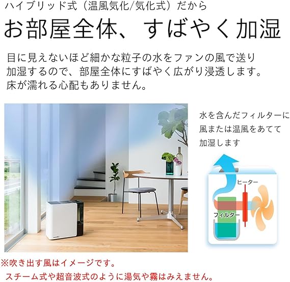 適用床面積:〔木造和室〕20畳(34m2)、〔プレハブ洋室〕33畳(55m2)●タンク容量:7L●最大加湿量:標準=1200ml/h 、静音・おやすみ快適=800ml/h、eco=6