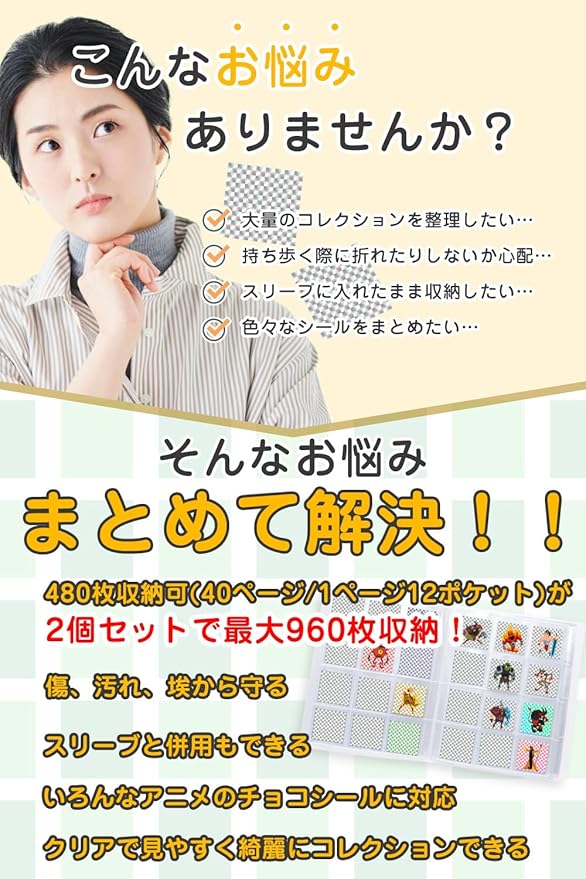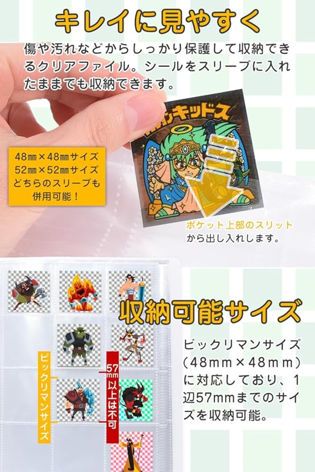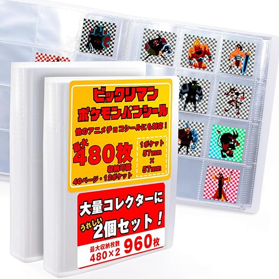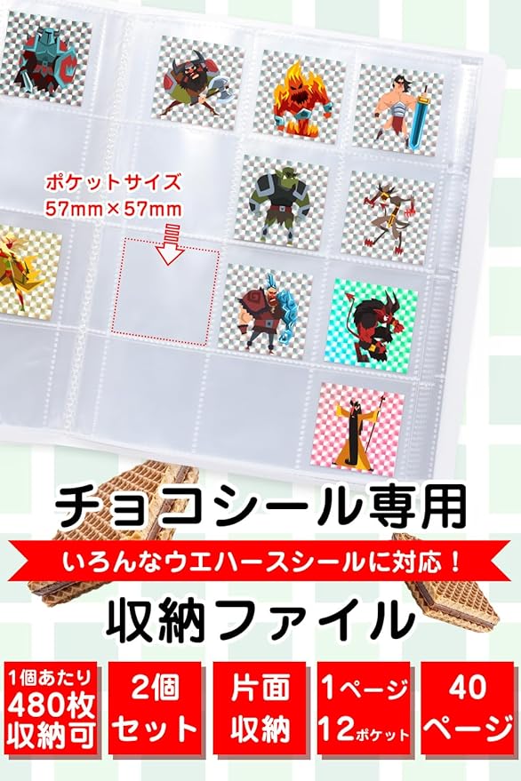 【大切なチョコシールを綺麗にコレクション! 】 お気に入りのチョコシールをしっかり収納し、傷や汚れ、埃から守る専用コレクションファイル。ビックリマンサイズ(54×54mm)に対応しており、ビックリマン以外のアニメや漫画などのチョコシール、菓子パンシールも収納できます。1個の収納枚数合計480枚(40ページ・1ページ12ポケット)収められる大容量設計です。片面収納タイプなのでシール裏のテキストも確認可能!透明ポケットで見やすく、鑑賞にもぴったりなコレクションアイテムです。