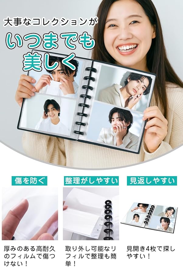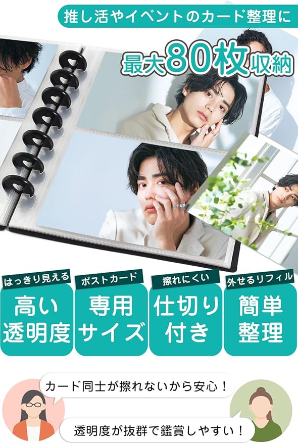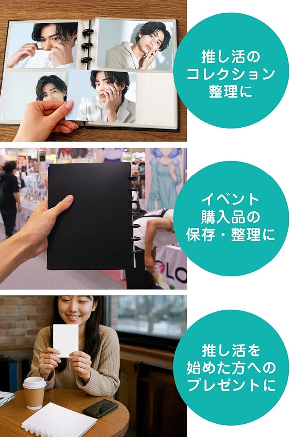 【推し活やイベントのカード整理にぴったり】特典カードや展示会グッズ、カフェでの配布品などをすっきり保管。ページをめくれば推しのカードがずらっと並び、眺める楽しみが広がります。持ち運びやすいサイズ感だから交換などにも便利です。