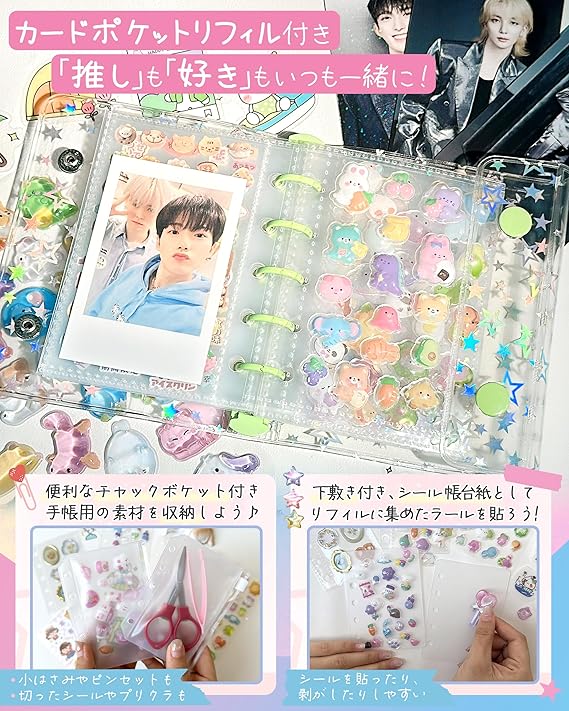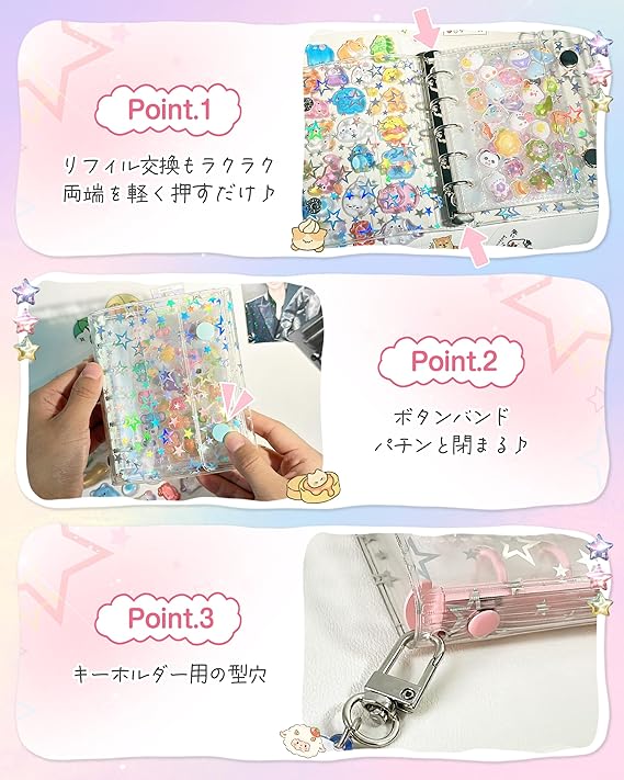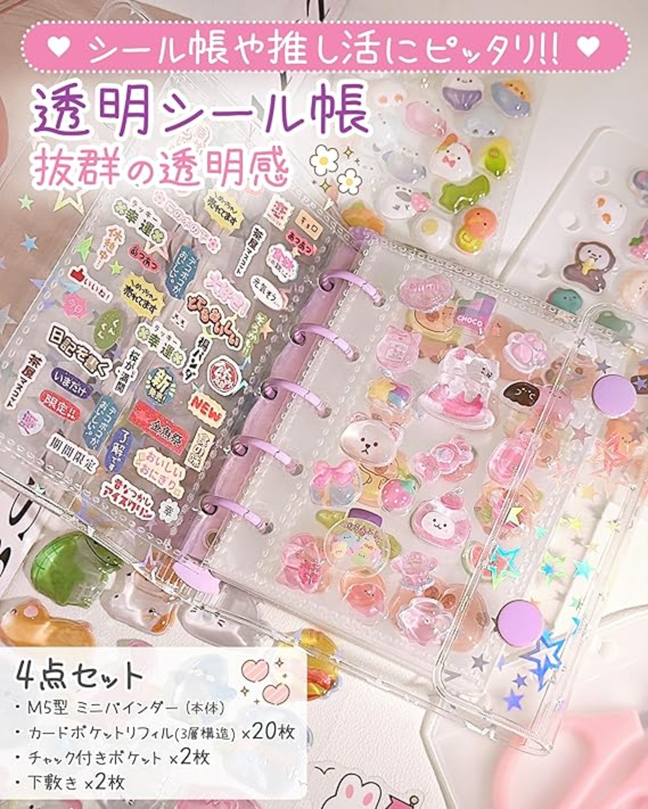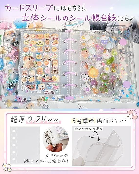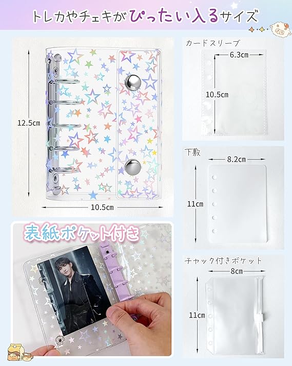 【M5サイズ シール帳バインダー】 セット内容:❶バインダー本体 ❷カードポケットリフィル(3層構造/プラスチックシート)×20枚 ❸チャック付きボケット×2枚 ❹下敷き×2枚。内寸約6.0cm×10.5cmのカードスリーブで、各種トレカや写真をしっかり収納、バインダーに穴のないカードや写真を追加できます。本体サイズ(約):縦12.5㎝×横10.5㎝×厚み2.5㎝。ホログラム加工の星柄が散りばめられたクリアバインダーは、光の角度によってキラキラと輝きます。お気に入りのシールやコレクションがより可