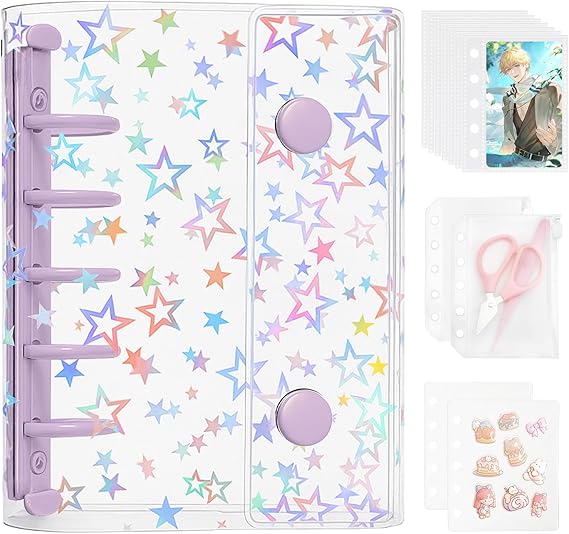 透明バインダー シール手帳 プラバン M5サイズ ミニ 【バインダー×1個 リフィル×20枚 チャック付きボケット×2枚 下敷き×2枚】3層構造PPシート カードポケット シール台紙 クリア 手帳 プリ帳 カードスリーブ 透明シール帳 はがせる ポケットサイズ シール 女の子 星柄タイプ パープル a