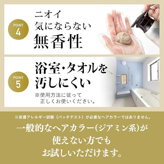 【おふろで簡単! 髪に塗って、5分で流すだけ】 頭皮や肌に着色しにくく*1、お風呂も汚れにくい*2。 ツンとしたニオイがない無香性。