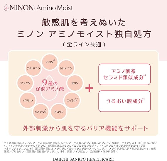 【ミノンから生まれたフェイスケア「ミノン アミノモイスト」】敏感肌を研究し続けた製薬会社がつくる独自の処方で「やさしさ」×「美しさ」を実現しました。バリア機能が低下しがちな肌を守りながら洗い、うるおいで満たして、すこやかに美しく保ちます。