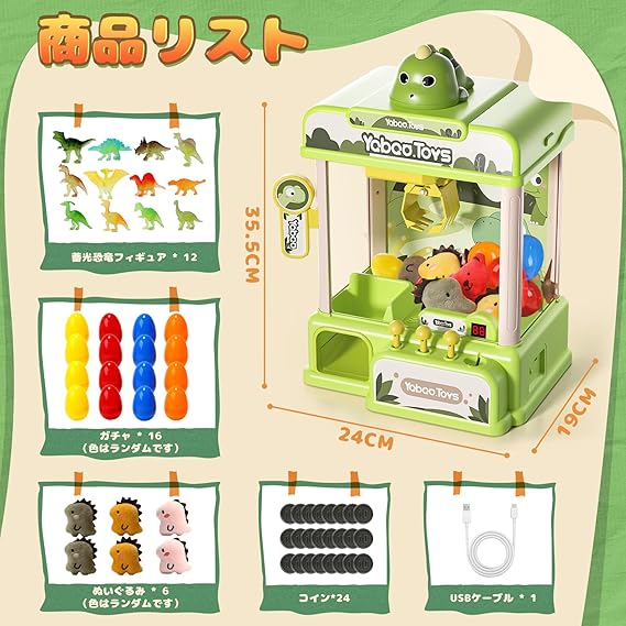 【可愛い恐竜クレーンマシン】リアルな恐竜デザインが特徴で、恐竜好きの子どもたちに大人気!アーケードさながらの本格操作が楽しめ、3つのジョイスティックでクレーンを自由に操って、恐竜ぬいぐるみやかわいいおもちゃをゲットできます。ご自宅で「恐竜世界」の冒険が楽しめます!
