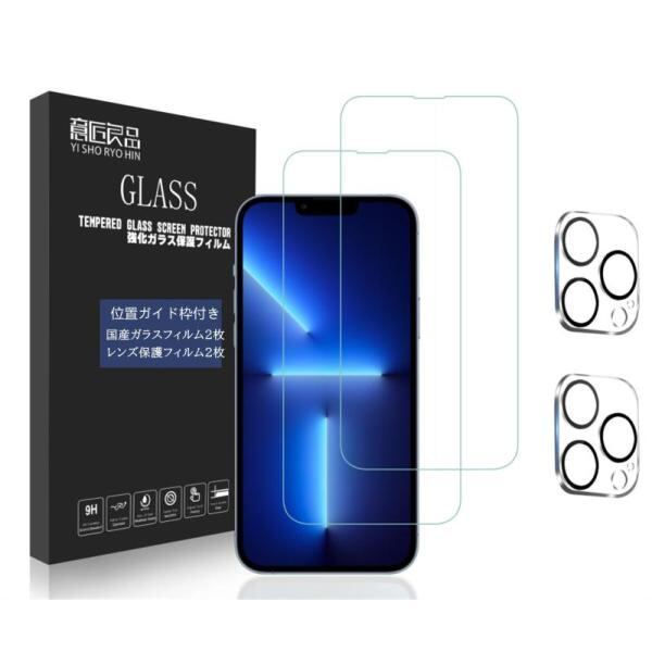 【対応機種】ガイド枠付き iPhone13proガフィルム2枚+レンズフィルム2枚 4枚セット 6.1インチに対応 【180日安心 】