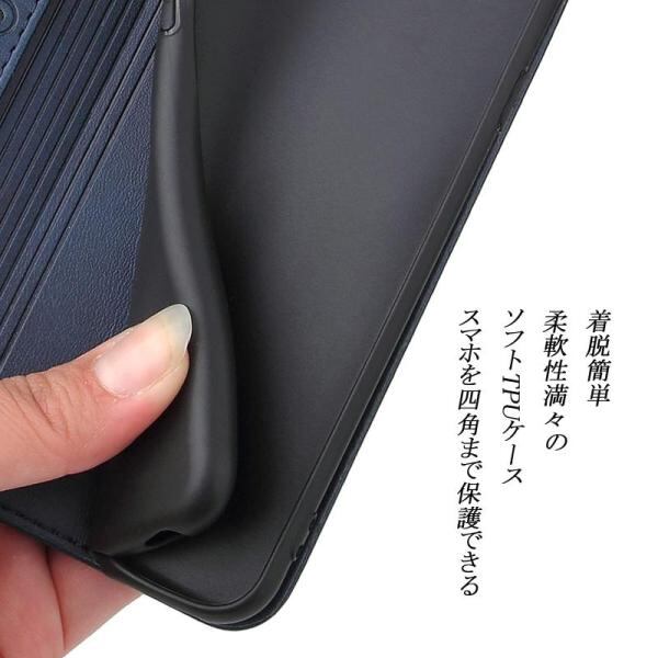 ?【素材改良】本商品の外部カバーは牛革繊維を人工合成という生産プロセスで仕上げられた合革で、普通の合革より、性能上の 耐熱性、耐摩擦が一層アップされた。表面生地が硬すぎず、やわすぎず、ちょっと良い手触りです。手汗が出てきても滑りにくく、ケースにも変な匂いがございません。インなケースは弾力性のあるソフト素材を採用しており、四角までしっかり保護でき、実用性高い手帳型です。