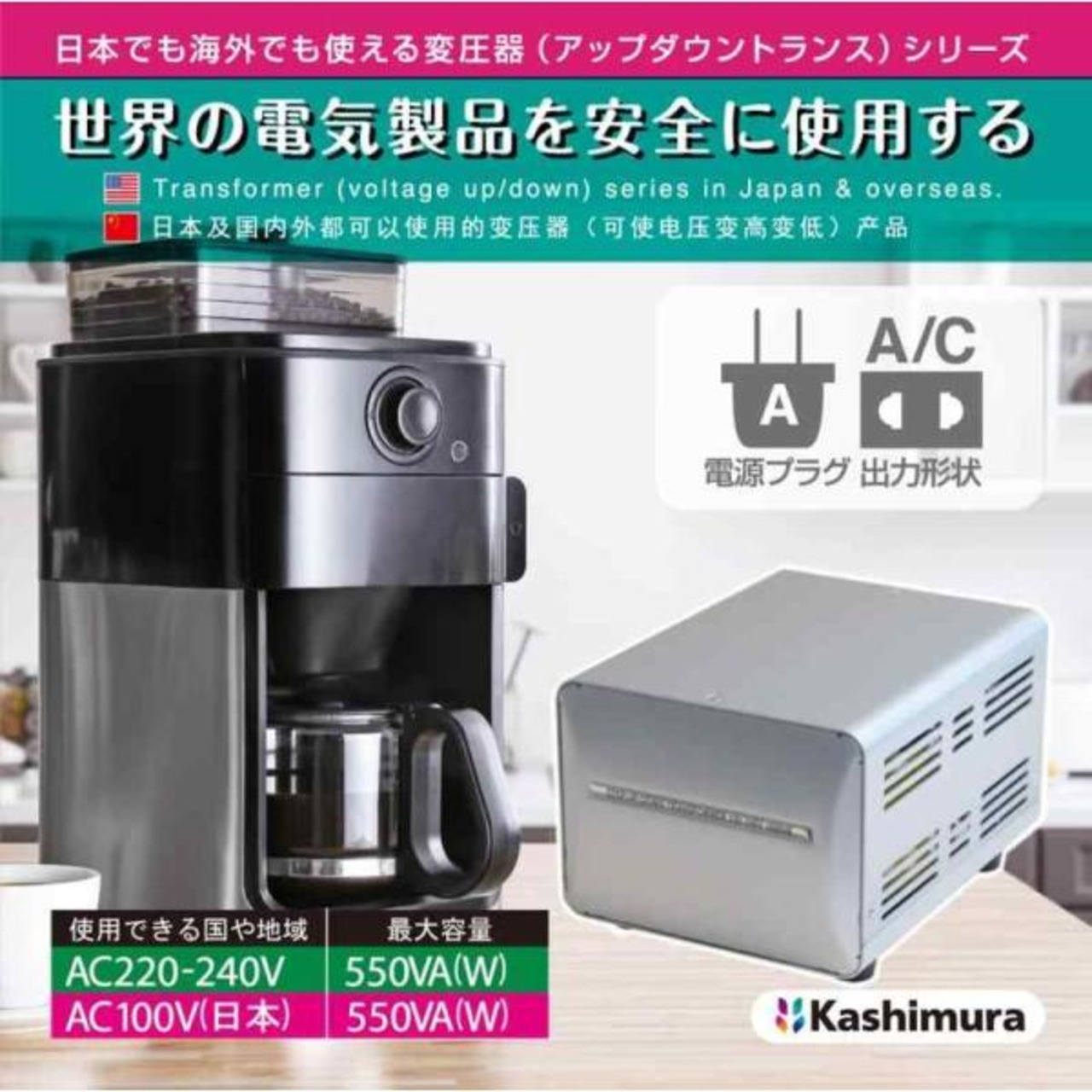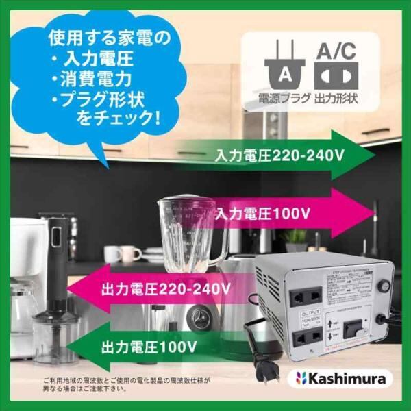 カシムラ(Kashimura) 海外国内用 変圧器 AC 220V ~ 240V / 550W 本体電源プラグ Aプラグ, 出力コンセント A ・ C1
