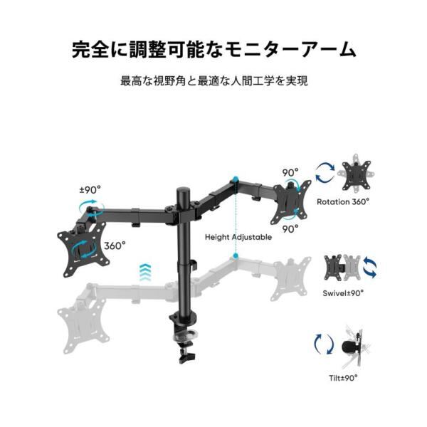 【自由に角度調整】本デュアルモニターアームは画面回転360°、画面左右180°、画面上下各90°調整可能です。腕の最大伸展長が400*