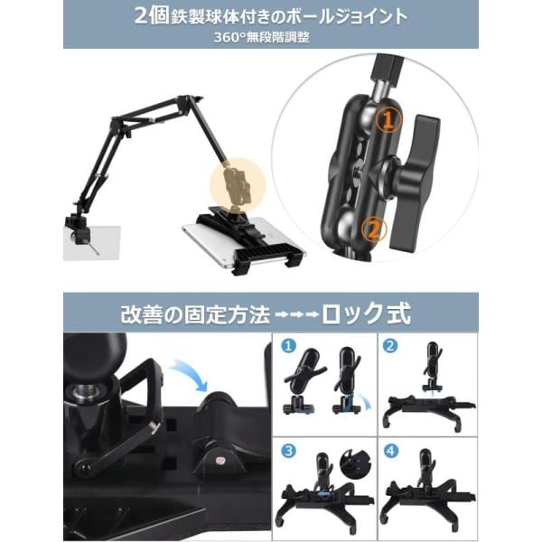 タブレット アーム 12.9 スタンド 寝ながら 4〜12.9インチ switch適用 Ipad Pro12.9 Mini Air Iphone 横/縱/仰向け 揺れない スマホ ベッドスタンド アイパッド 固定アーム ごろ寝 床置き 卓上 折り畳み