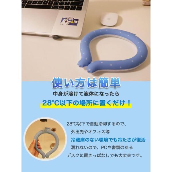 暑い真夏の季節でもクールリングはひんやりキープ28度または24度以下の空間で凍る不思議な氷「PCM素材」で作られた首元用のネッククーラーであるクールリングは、心地良い温度で首の頸動脈を効率的に冷やすので熱中症対策にもオススメです氷のように冷えすぎないクールリングなので、低温障害の心配もなくお肌にもやさしい