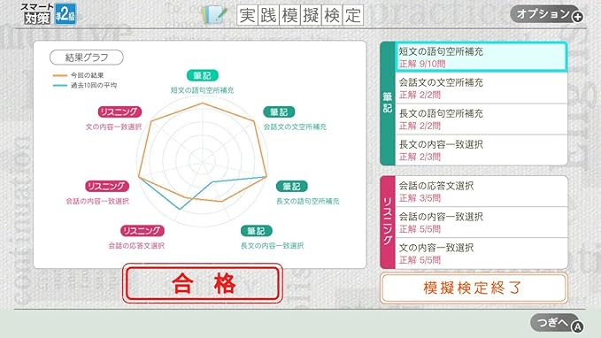 実践模擬検定で実力チェック。結果はレーダーチャートもあるから得意不得意が一目瞭然!