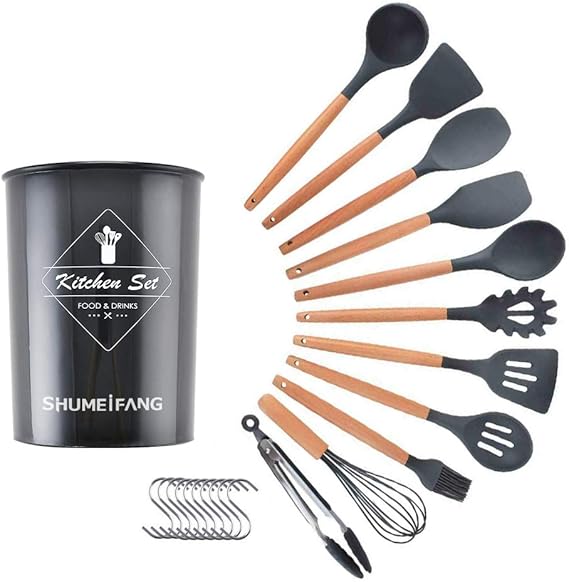 shumeifang キッチンツール キッチン用品 調理器具11点セット 木製クッキングツール おたま フライ返し 台所用品 耐熱シリコン 日本食品安全認証済み FDA認証済み トング ヘラ 泡立て器 ブラシ スパチュラ パスタサーバー レードル ターナー スプーン調理 料理 製菓器具 抗菌のキッチン用品・調理器具 抗菌のキッチングッズ特集 収納スタンド1点 S字フック (ブラック)1