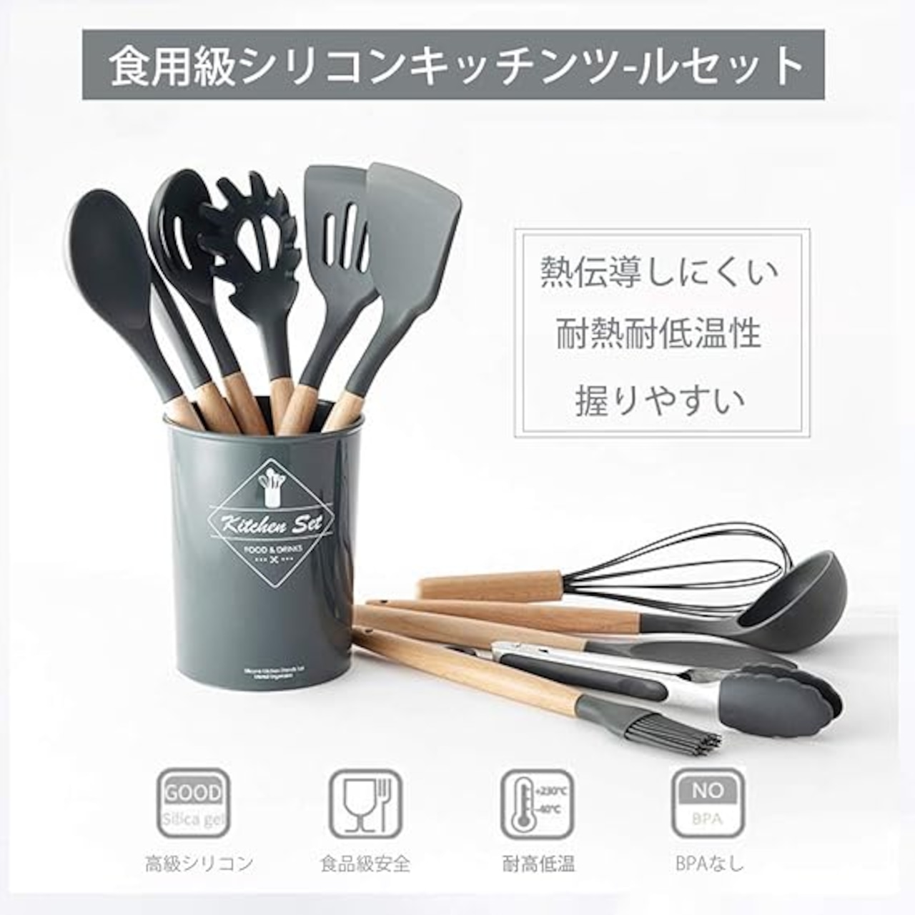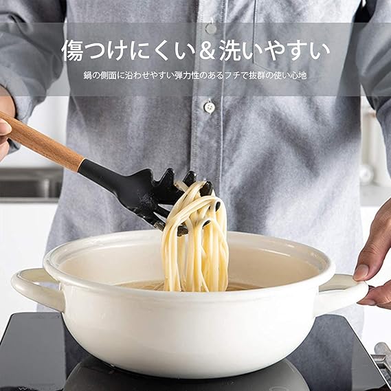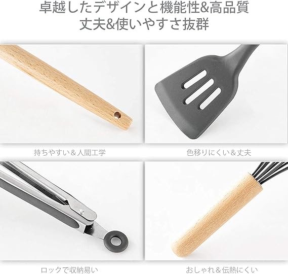 【安全性】このキッチンツールセットはシリコーン素材で作られており、有害なビスフェノールA(BPA)を含まず、LFGB、SGS、FDAのテストに合格しています。 木製のハンドルは熱を効果的に伝導するだけでなく、シリコーンの柔らかさと一定の硬度を持っています。
