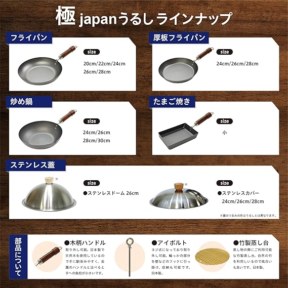 素材・材質:本体/鉄(冷間圧延鋼板)、ハンドル/木、本体の表面仕上げ/特殊熱処理(窒化)