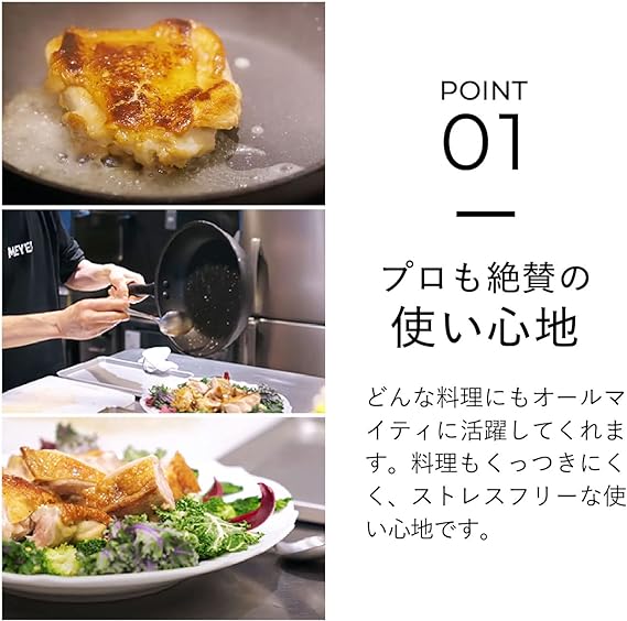 リム周り、リベットにもふっ素樹脂加工をし、食材がこびりつきにくい。
