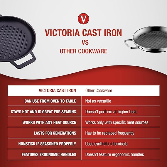 ?ビクトリアの鋳鉄製グリルパンは保温性と熱分散性に優れています。人間工学に基づいた設計で100%天然の亜麻仁油コーティングで仕上げられています。