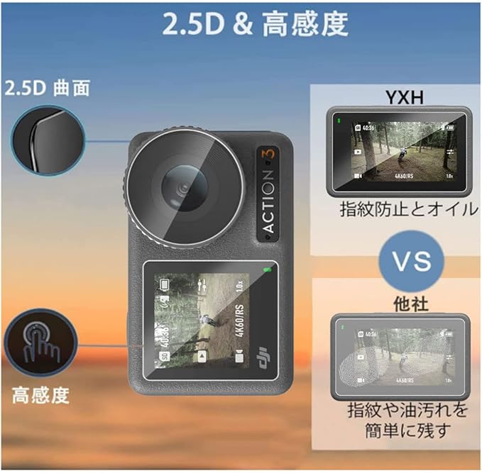 【対応機種】 DJI Osmo Action 3 フィルム 強化ガラス 液晶保護フィルム。 撥油コーティング加工されているため、耐油性に優れ、指紋付きにくく、付着した汚れも簡単に拭き取れます。