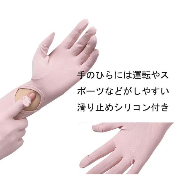 指先までしっかり日焼け止め:手首、親指、人差し指部分は穴空きになっているためすぐに外してスマホなどちょっとした作業や操作が可能です。指出し縫製タイプ(親指と人差し指のみ)ですので、着用しながらもスマホを簡単操作できます。