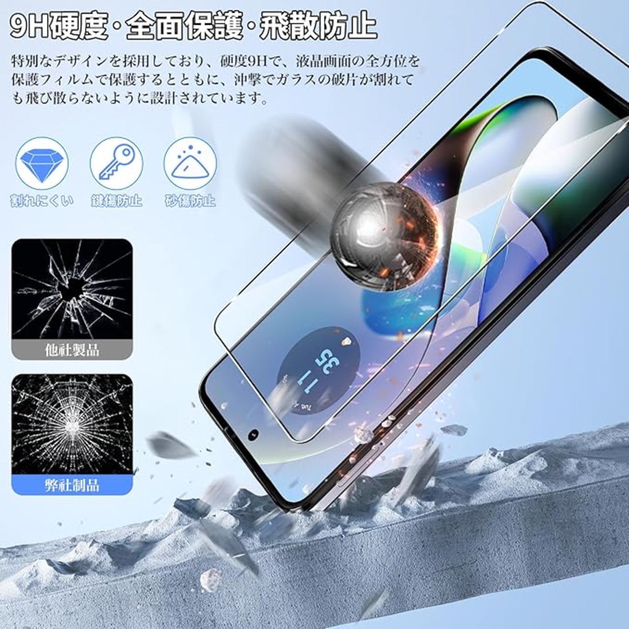 【9H硬度】日本製の旭硝子素材を使用し、優れた耐衝撃性で落下や摩擦、衝撃による破損を抑制し、画面を傷から守り、本体を最大限に保護します。また、一般的なガラスに比べ飛散しにくい特殊加工を施しているため、万が一フィルムが割れても破片が飛び散らず、二次的なダメージを与えません。