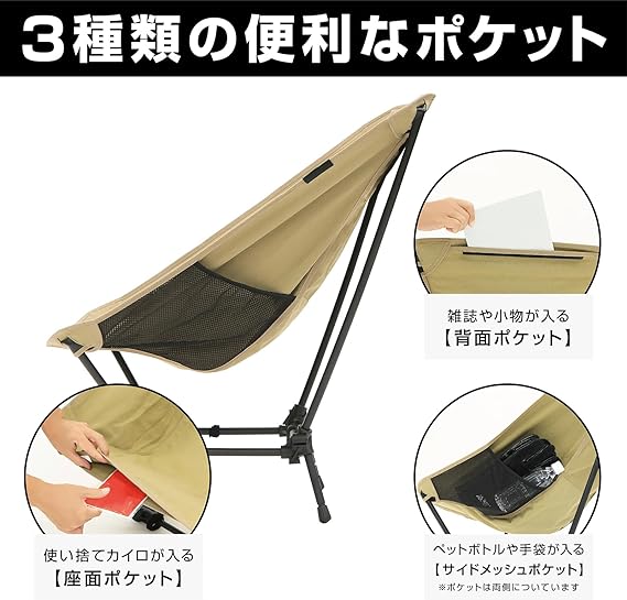 【焚き火を楽しめる帆布】シート生地素材には火の粉に強い帆布生地を採用しています ※帆布は燃えない素材ではありません。直接火を椅子に近づけないでください【3種類の便利なポケット】使い捨てカイロやペットボトル、雑誌や小物を入れられます