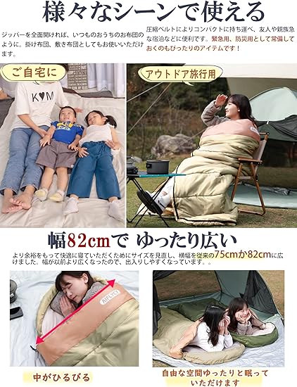 【商品サイズ&品質サービス】使用時:(約)210×82cm; 広げた時:(約)210×160cm; 収納時サイズ:約 35×17cm 重さ:約1.0kg 最低使用温度:0℃ 快適温度20℃です。100%熱心なサービス:防水、柔らかくて快適で、耐久性に優れています。お買い上げ日より2年間のサービス付きです。何かご問題ございましたら、どうぞお気軽にご連絡ください。注意:寝袋の耐寒範囲は、寝袋の重量と個人の耐寒によって異なります。重さ:約1.4kgは耐寒範囲:約-10℃ ~ 25℃,重さ:約1.8kgは耐寒範囲:約-15℃ ~ 25℃,重さ:約2.2kgは耐寒範囲:約-20℃ ~ 25℃。【購入保証】1年間の品質保証を付いており、もしも商品がお手元に届かない、もしくは商品に問題があった場合はお手数おかけ致しますが、お問い合わせメールアドレスにご連絡ください。サポート担当者が迅速に対応させていただきます。