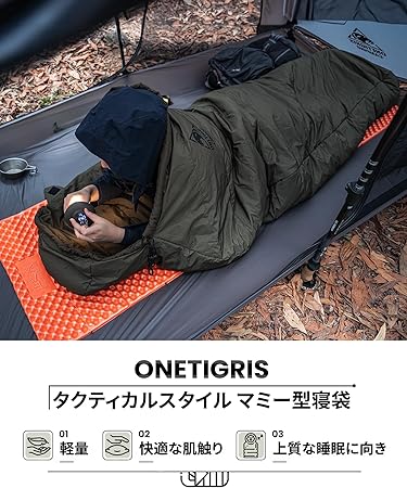 【フィットデザイン・マミー型スリーピングバッグ】OneTgris マミー型シュラフは体にフィットするよう標準的なサイズで裁断され、フリースのような肌触りで、体に触れる快適性が向上しています。足元は幅広の台形のスペースで、寝るときに窮屈さを感じることはありません。アウトドアでも甘い眠りを楽しめ、布団のように快適に眠れます