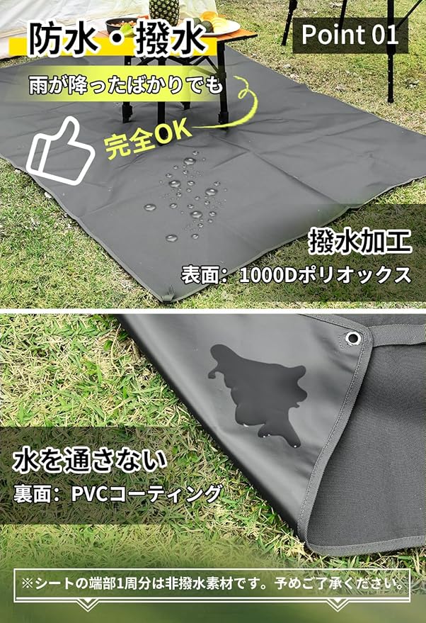 「注意事項」①本シートの表面は撥水加工済みですが、撥水効果を持続させるために定期的なメンテナンスが必要です。 ②一般的なグランドシートより重いです。 ③素材の特性により裏面に白い折り目が生じる場合がありますが、不良ではありません。 ④タープや陣幕など用途に向きません。 ⑤シートの端部1周分は非撥水素材です。