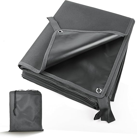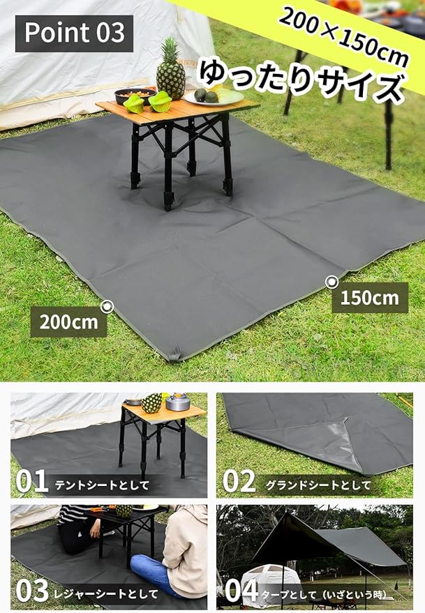 「製品仕様」展開サイズ:200×150cm 収納サイズ:33×43×5cm 重さ:1.9kg 素材:表面:厚手1000D ポリエステル オックスフォード 裏面:PVC 銅製ハトメ×4 ループ×4 耐水圧:4000mm