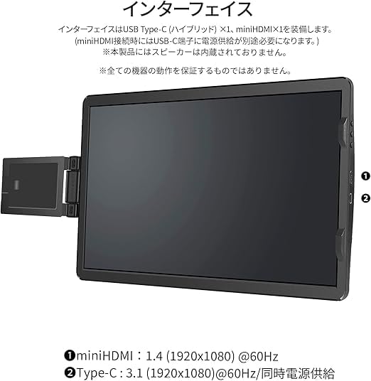 入力端子としてハイブリッド対応(モニターへの電源と映像を1本で送信)のUSB Type-Cを1つとminiHDMIを一つ装備します。*miniHDMI使用時には給電用のUSB Type-C端子から電源供給が必要になります。