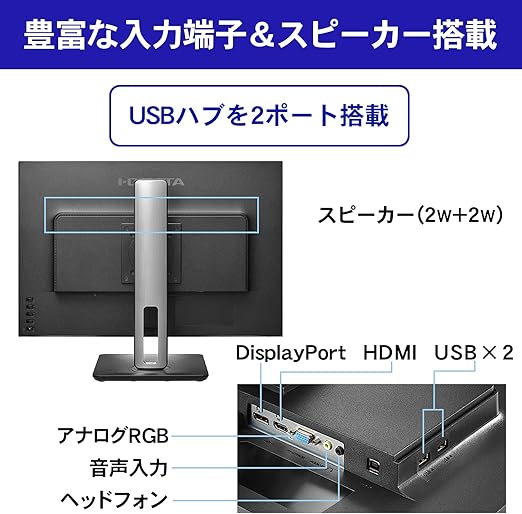 [端子]HDMI×1/DisplayPort×1/アナログRGB×1/USB2.0Type-Bx1/USB2.0Type-Ax2/音声入力/ヘッドフォン端子/スピーカー