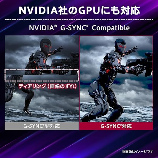AMD FreeSync、NVIDIA G-SYNC Compatibleに対応。ティアリングやスタッタリングを軽減し、映像をより滑らかに。