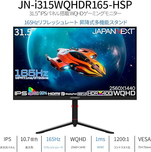 【Amazon.co.jp限定】JAPANNEXT 31.5インチ IPSパネル搭載 WQHD(2560x1440)解像度 165Hz対応 ゲーミングモニター JN-i315WQHDR165-HSP HDMI DP HDR400相当 PS5 sRGB99% 高さ調整 ピボット機能搭載