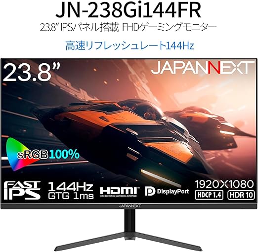 JAPANNEXT 23.8インチ Fast IPSパネル搭載 144Hz対応 フルHD(1920x1080)解像度 ゲーミングモニター JN-238Gi144FR HDMI DP sRGB:100% 1ms(GtoG)