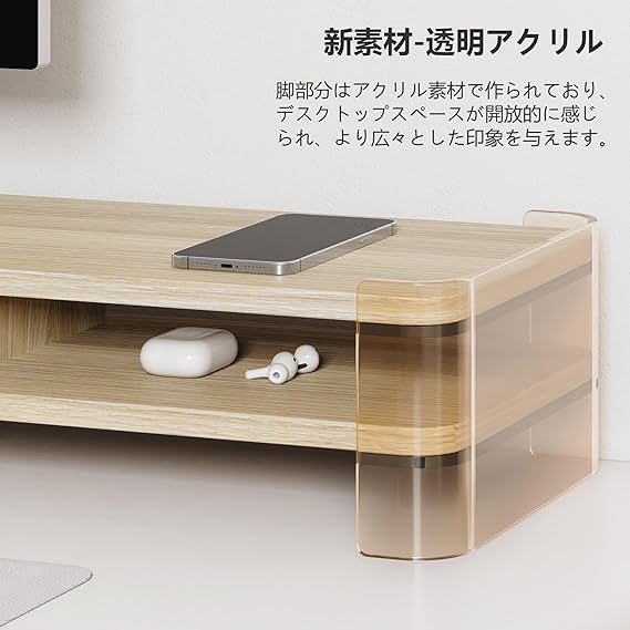 Fenge モニター台 モニタースタンド 卓上 机上台 パソコン台 PC台 机上ラック 110cm横幅 2段 木製天板 アクリル製脚 デスクトップ用 机上 モニタースタンド 机上台 pcモニター台 パソコンラック 卓上 収納 整理整頓 オークG04T2103C