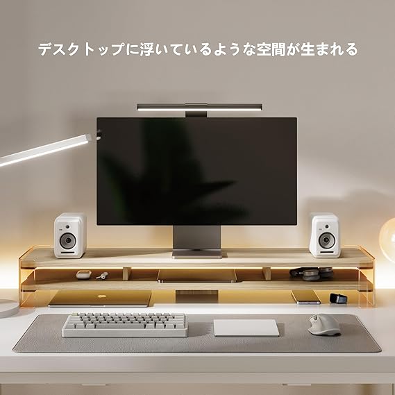 ????【アクリルの脚・浮いている空間】モニタースタンドの脚は、透明なアクリル板を採用しており、解放感があります。さらに、デスクトップに浮いているような感覚を与えます。特に夜にはLEDライトと組み合わせると、爽やかな昼間とは一変、神秘的な雰囲気を作り出します。