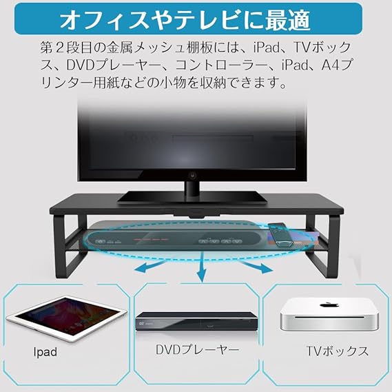 【二段収納&省スペース】 二段目の金属網状棚(取り外し可能):iPad、DVDレコーダー、付箋や、ペン、ファイル、ノートPCなどをしまっておくにも便利。 モニター台の下:大きめのキーボード収納できるし、ホコリ等が溜まりにくくなります,机の上も広くなりました,空いたスペースで読書や事務作業など、デスクを広く快適に使えます。