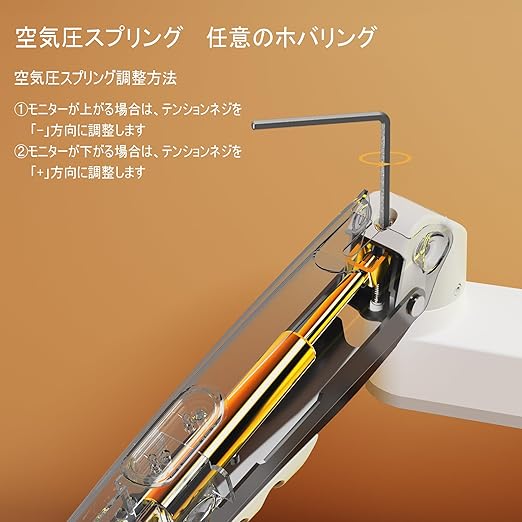 【幅広い可動域で自由に動かせる】①アーム:超高精度ガス圧で高さ調節、9.8 インチ (260 mm) の直立リフト ②ディスプレイアームの3つの関節がそれぞれ可動でき、高さも調節でき、簡単に欲しい位置を移動できます。また、モニター画面は上向き85°、下向き30°、回転360°、左右各90°を調節ができますので、デスクトップの環境に合わせて、画面を左右に配置したり、上下に配置したり、自由な配置ができます。