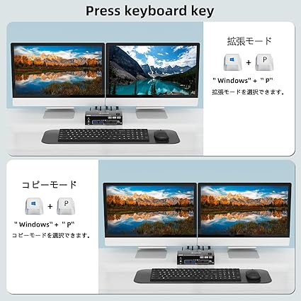 【コピーモード・拡張モードをサポート】コピーモードでは、メイン画面をサブ画面にコピーできます。拡張モードでは、メイン画面からサブ画面にウィンドウをドラッグできます。「Windows」キーと「P」キーを押して、コピーモードまたは拡張モードを選択することができます。