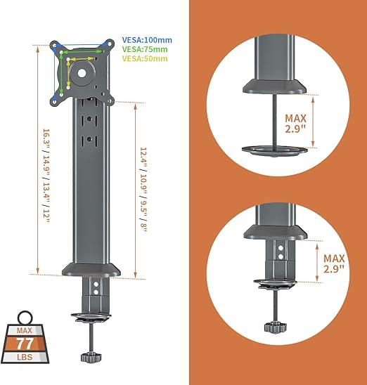 モニターデスクマウント ? シングルモニターデスクアームスタンドは、最大32インチまでのほとんどのフラットまたはカーブしたコンピュータスクリーンにフィット、最大75ポンドまで保持できます。VESAパターン75x75mmと100x100mmに対応。